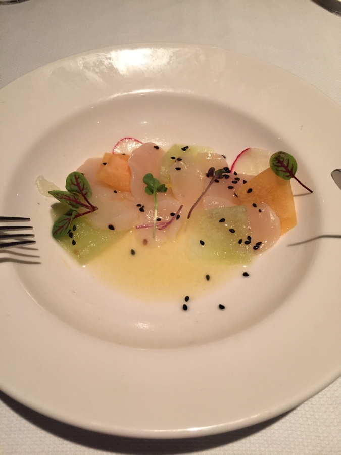 The first of four courses was a wonderful amuse, a ceviche variant combining giant scallops and melon with yuzu and herbs. It was matched with a fruity Sauvignon Blanc called Emmolo, the line of wines handled by Chuck Wagner’s daughter, Jenny – this wine also had it’s own hints of citrus and melon with a mild acidity also making it a great pairing.