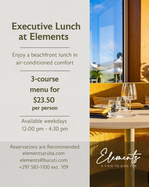 “We wanted to give Aruba’s business community a real reason to leave the office at lunchtime,” said Nicolas Nemalceff, Food & Beverage Director at Bucuti & Tara Beach Resort. “Elements offers something rare: a quiet, beautiful space where a conversation can actually breathe. Good food, a great view and no distractions. That combination is hard to beat.”
